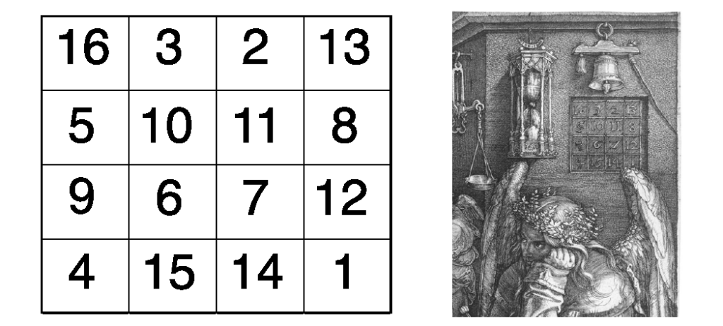 This is a section from a picture by Albrecht Dürer (1471-1528) it shows a 4 x 4 magic square. To make it easier to read, it is presented below.
