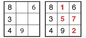 The left-hand column adds up to 15, which tells us that all columns, rows and diagonals must add up to 15.