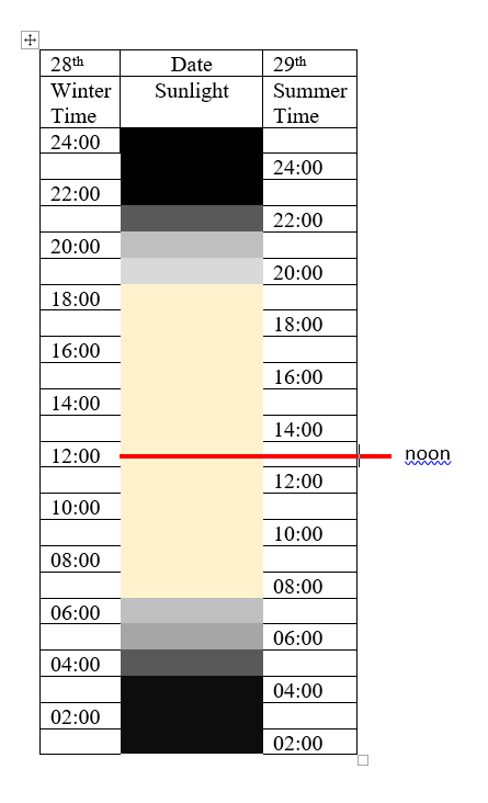 Effect of changing the clocks forward one hour between 28 and 29 March