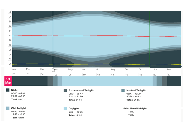 The Earth rotates around it’s own axis and one rotation is completed in one day. This means the Earth rotates 360 ° per day or 15 ° per hour. Ideally, this would mean that our position in relation to the sun only changes by 15 ° each hour. The Earth, however, also rotates around the sun and it is tilted by 23.5 ° which means that half the year the northern hemisphere is tilted towards the sun and the other half of the year the southern hemisphere is turned towards the sun. This causes the changes in daytime hours. This also causes the changes in season: while we are now in the middle of spring, the trees are changing colour in autumn in New Zealand. But what happens when we come to equator? The closer we come, the less variation is there in length of the days throughout the year and at the equator, the daytime period lasts about 12h each day.