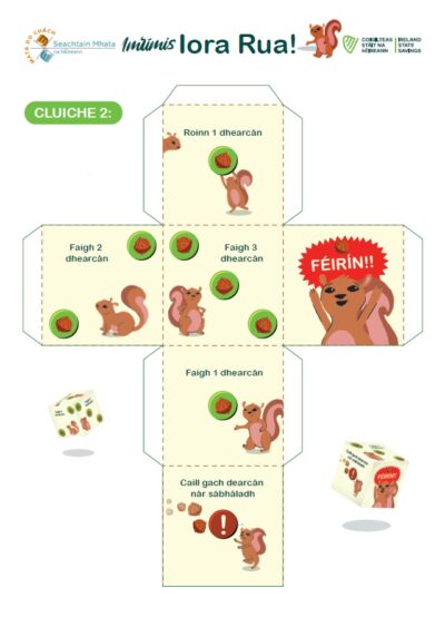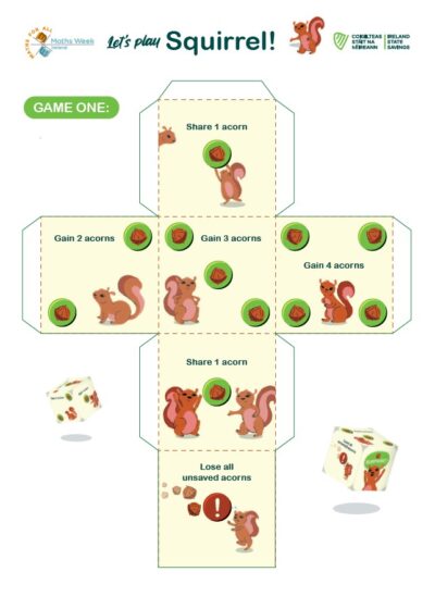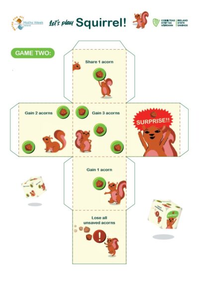 Activity: The aim of the game is to gather acorns to survive the winter. Pupils will throw the dice as many times as they want and decide when to stop and save their resources. On some faces they earn acorns, in other they have to share and one will make them lose all they unsaved acorns! Be careful not to be too greedy! “Lose all unsaved acorns” will end a players go.